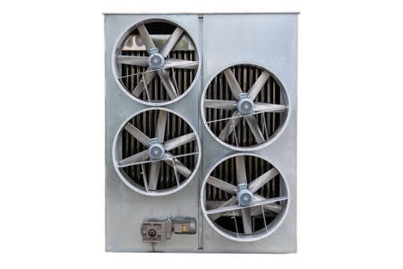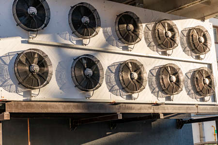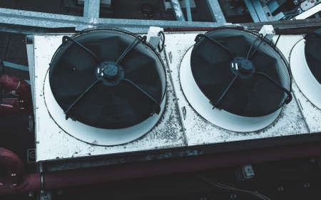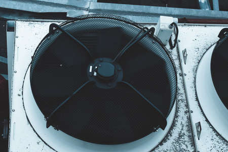 Industrial fans for air conditioning. Dirty air conditioner works behind a metal grate.