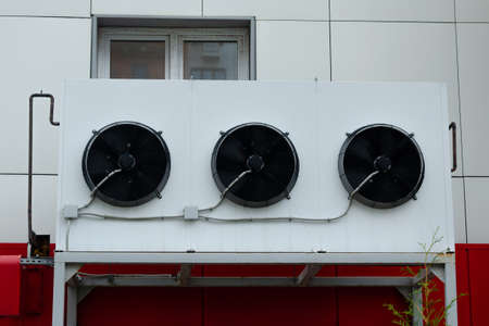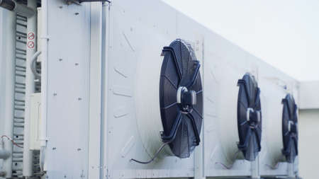 Close-up of row of three exterior air condition units. Grill covered electric fans. Detail of industrial building equipment.