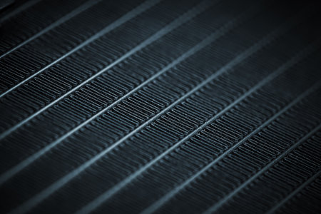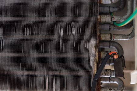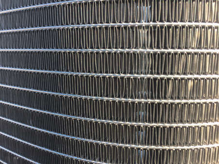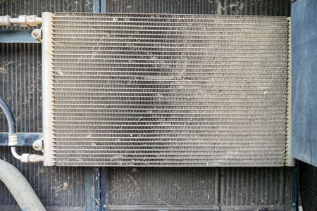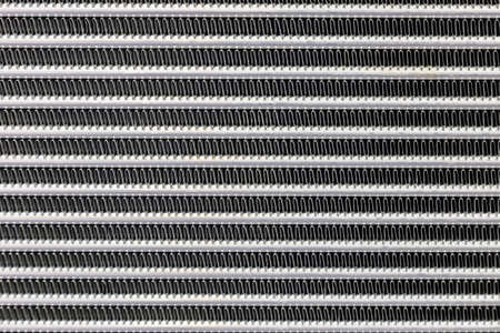 Condenser unit used in central air conditioning systems - heat exchanger (heat micro canel) section to cool down and condensate incoming refrigerant vapor into liquid. background texture. technology.