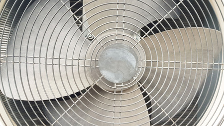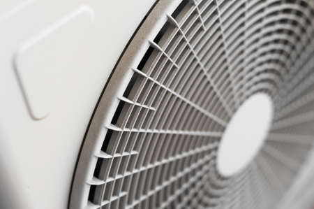 Air conditioning machines equipment concept. Closeup of black fan on white machine