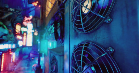 Cooling fans are mounted on a wall in a vibrant urban alley filled with colorful neon lights. The night setting highlights the lively atmosphere of the city.