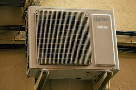 Classic Split air conditioner house system. Externally fitted unit on brick wall