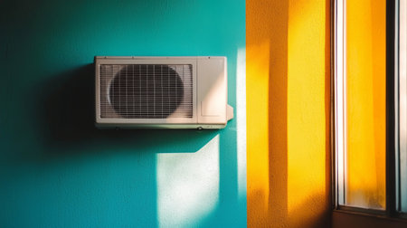 A vibrant scene showcasing an air conditioning unit mounted on a yellow and turquoise wall, casting distinct shadows.