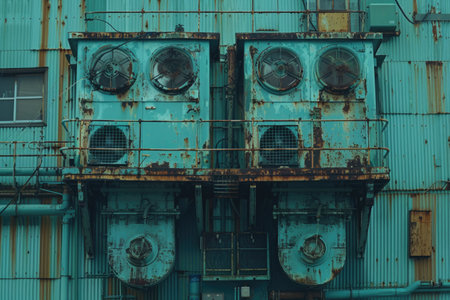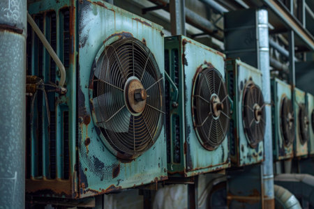 A close-up view of an industrial air cooling system featuring three prominent circular fans on a grid wall, highlighting unique textures and weathered materials in design.