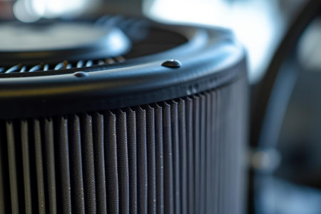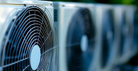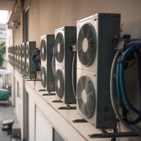 Air conditioner compressor arranged in a row on the balcony, Generative Ai illustration