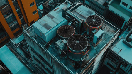 Aerial view showcasing industrial cooling towers on a rooftop amidst city buildings. The scene highlights modern architecture and urban infrastructure.