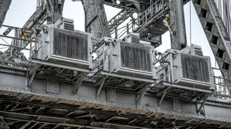 Three industrial air conditioning units mounted on a large building structure feature a robust metal framework, showcasing modern cooling technology and engineering.