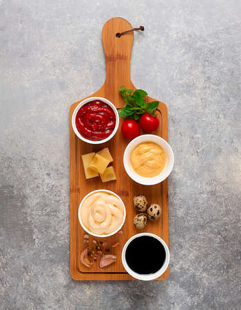 Set, assortment of sauces, ketchup, mayonnaise, cheese, soy, green, on a cutting board, with ingredients, on a gray table, top view, no people,