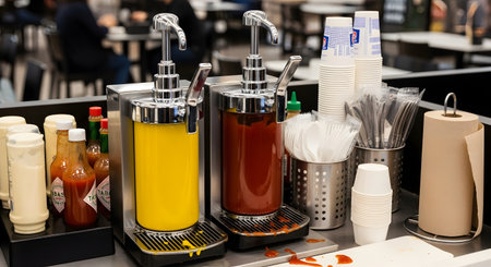 A self-service condiment station in a fast-food restaurant or cafeteria, equipped with large pump dispensers for mustard and ketchup. The station also includes hot sauce bottles, stacked cups, plastic cutlery, and a paper towel roll for customer convenience.
