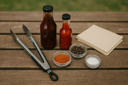 Various BBQ sauces, spices, and utensils are organized neatly on a wooden surface, ready for a summer cookout in an outdoor setting surrounded by lush grass.