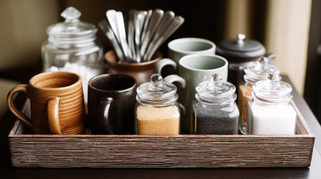 A beautifully arranged collection of coffee accessories featuring jars of sugar, stylish mugs, and elegant spoons on a wooden tray, ideal for any caf