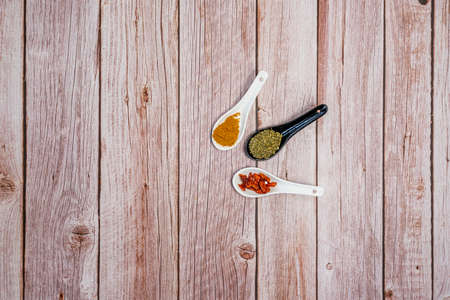 three porcelain spoons, one black and two white with whole cayenne, yellow curry and dried oregano leaves on wooden table