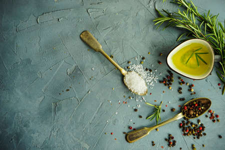Cooking food background with herbs, olive oil and spices, black stone concrete background above copy space