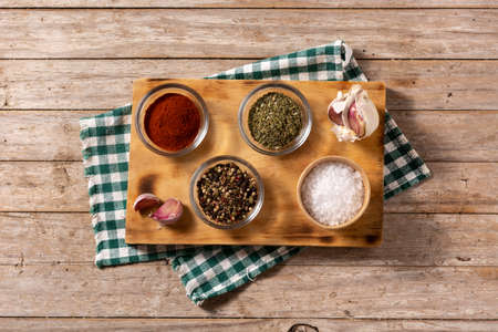 Spices and herbs on wooden background. Food and cuisine ingredients.