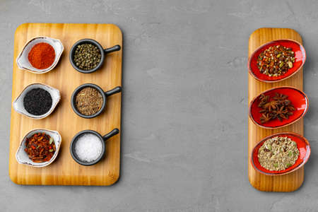 Small bowls with spices on gray background