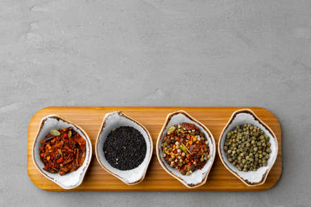 Top view of spice blends in small containers, clean background, no people, copy space