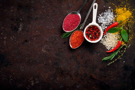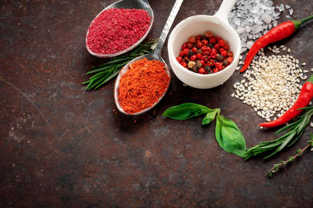 Spices on a dark rusty background, pepper, Basil, salt, rosemary, thyme, turmeric, paprika. herbs and greens set top view and copy space