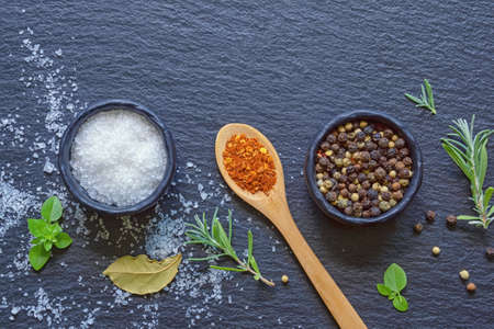 Salt in mixed pepper in dark spoons on black ceramic plates on slate stone with rosemary and thyme herbs