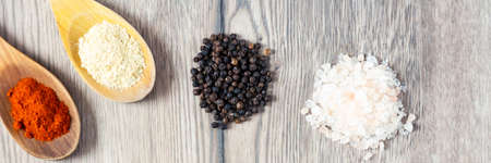 yeast flakes and red pepper on the wooden spoons, pink salt, black grainy pepper, horizontal, panorama,