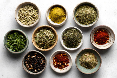 Variety of spices and herbs arranged in small bowls on a light surface