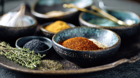 A captivating arrangement of colorful spices and aromatic herbs displayed in rustic bowls, perfect for cooking and baking enthusiasts seeking natural flavors.