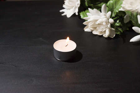 The concept of remembrance, funerals, and condolences. Candle and white flowers, free space for text