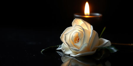 A beautiful white rose sits in front of a lit candle on a dark reflective surface with a black background
