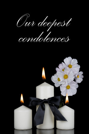 Condolence card. Memorial frame with black ribbon. White flowers and a burning candle. Black background.