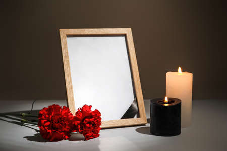Black funeral ribbon, blank photo frame and carnation flowers on dark background with space for text