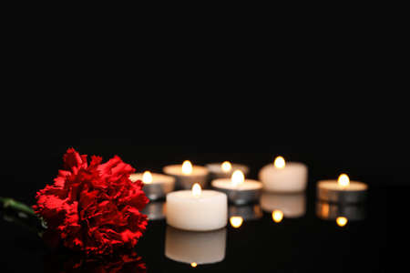 Funeral symbol. A bouquet of white flowers and burning candles, black background, free space for text. Satin ribbon in the corner.