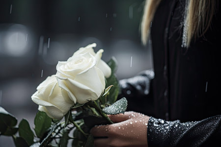 Closeup of people in black attire holding white rose flowers at a funeral ceremony, honoring loss and offering condolences