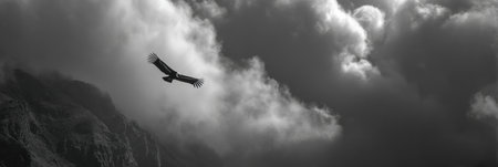 An impressive sight of an eagle gracefully soaring above stunning mountain peaks. This black and white image captures the essence of freedom in nature's embrace.