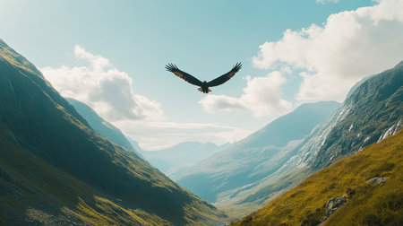 A stunning image of a majestic eagle soaring gracefully over a serene mountain valley, framed by lush greens and dramatic skies, capturing nature's beauty.