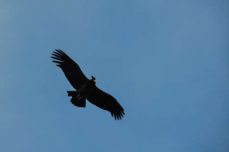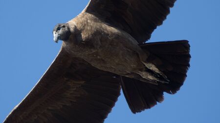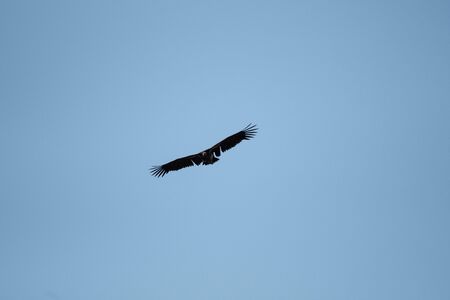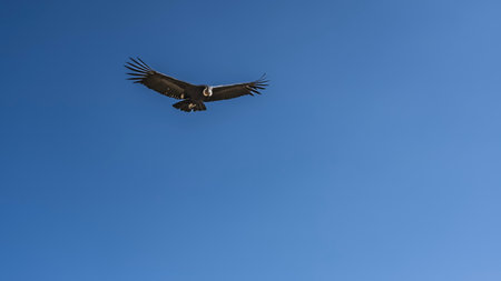 A condor is flying in the blue sky. A big beautiful bird spread its wings.Peru. Colka Canyon. Copy space.