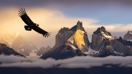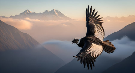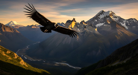 An Andean Condor soaring gracefully over the rugged peaks of the Andes Mountains