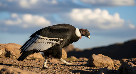 A majestic Andean condor is captured walking on rocky, arid ground, with a beautiful sky and clouds in the background. The large bird of prey, with its distinctive white neck ruff, is shown in profile, highlighting its impressive size. This image is a beautiful portrait of South American wildlife in its natural habitat.