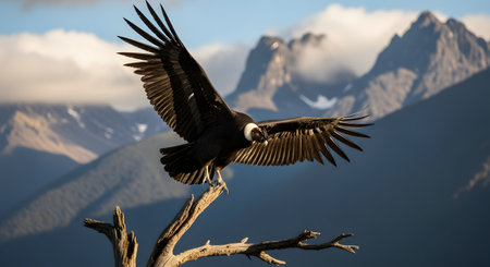 A magnificent Andean condor is perched on a dead tree branch, spreading its massive wings against a backdrop of rugged, cloud-covered mountains. The powerful bird of prey is preparing for flight in its high-altitude habitat. The image captures the grandeur of the condor and the wild beauty of the Andes.