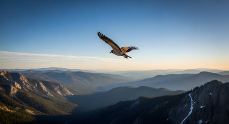 A magnificent hawk or eagle soars with its wings spread wide, gliding gracefully over a vast mountain range at sunset. The panoramic landscape and the lone bird against the clear blue sky create a powerful and inspiring symbol of freedom, perspective, and wild nature.