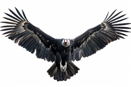 A majestic Andean condor soars gracefully with its massive wingspan fully extended. The impressive bird is framed against a stunning backdrop of rugged, snow-capped peaks of the Andes Mountains. This image captures the raw beauty, freedom, and power of this large flying bird in its natural habitat.