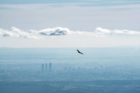 Far aerial view of Madrid city with a vulture flying over it. Concepts of city and nature, wildlife and freedom.