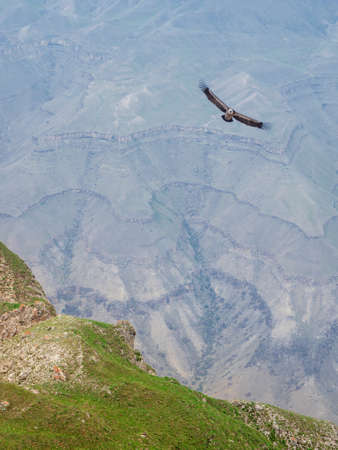 Eagle over the dark canyon. Travel all over the world. Vertical view.