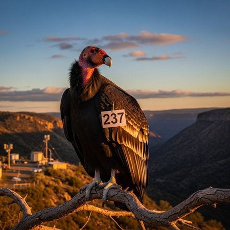 A majestic California Condor soars against a breathtaking autumn landscape Vibrant golden foliage paints the mountainous backdrop, creating a scene of unparalleled beauty This captivating image is a testament to the wonders of nature and the grace of these magnificent birds Perfect for nature enthusiasts and wildlife photographers AI Generative