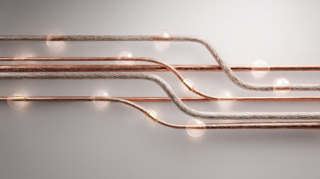 Abstract arrangement of copper and aluminum braided cables with smooth curves, glowing connectors, and translucent glass spheres on a light background.