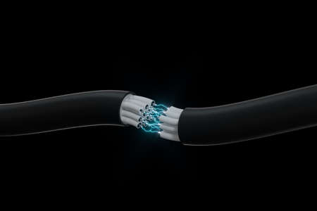 Cable with extended core, electronic connection product, with lightning effect 3d rendering. Computer digital drawing.