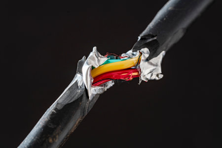 A close up of a broken electric cord with red and electric yellow wires intertwined. Damaged power electrical cable on black background