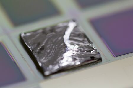 A wafer is a thin slice of semiconductor material, such as a crystalline silicon, used in electronics for the fabrication of integrated circuits.Selective focus on pieces.