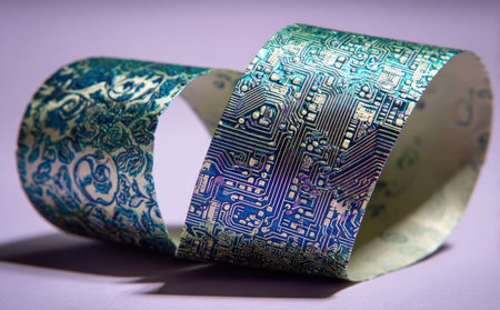 A ribbon in the shape of infinity features a circuit board design on one side and floral on the other