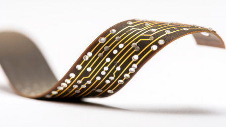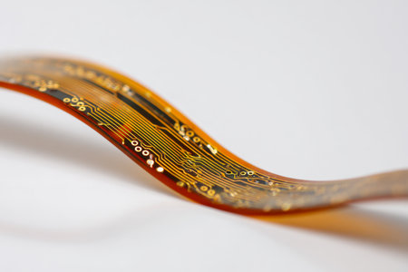 Medium shot of a flexible gold printed circuit tracing bending smoothly highlighting its adaptability for wearable technology.