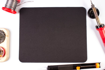 tools for amateur radio and soldering radio components in the workplace on white . taken in close-up with space for text, subject, advertising, or educational materials