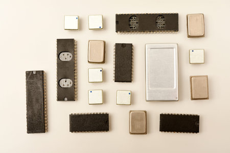 Old chips on a white background. Electronic components. Processors in metal and plastic cases.